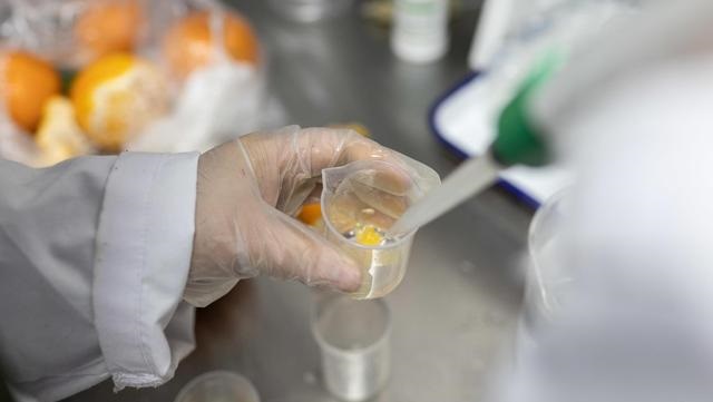 在農(nóng)殘檢測室內(nèi)擺放著的各式各樣的滴管、玻璃杯、離心管等,檢測人員將記者帶去的沃柑剝皮,將皮捏碎后放入燒杯,用藥水浸泡后再加入試劑,等待十余分鐘,將燒杯中的液體倒入試管,隨后將試管放入寫著“農(nóng)藥殘留檢測儀”的儀器。一分鐘后,檢測儀便顯示出結(jié)果。