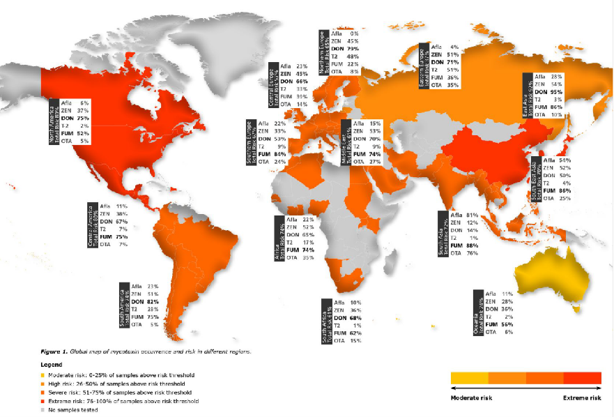 動物飼料及農(nóng)產(chǎn)品中霉菌毒素的產(chǎn)生具有一定的地域性。例如,熱帶和亞熱帶區(qū)域是曲霉菌生長的最佳環(huán)境。盡管如此,飼料和農(nóng)產(chǎn)品貿(mào)易的全球化導(dǎo)致霉菌毒素在全世界范圍內(nèi)傳播。