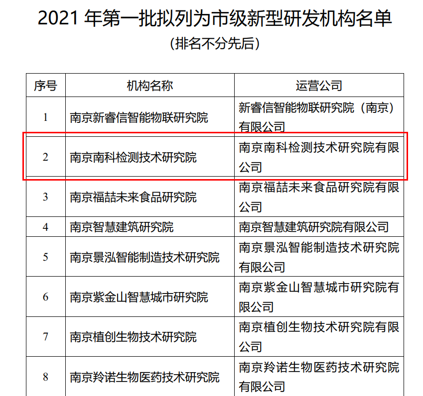 熱烈祝賀南京南科檢測(cè)技術(shù)研究院入選南京市新型研發(fā)機(jī)構(gòu)